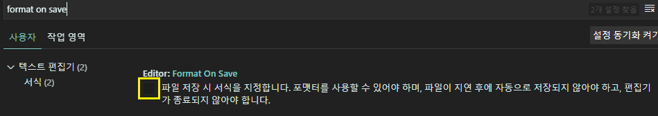 2. 설정에서 'format on save' 검색하여 체크 해제