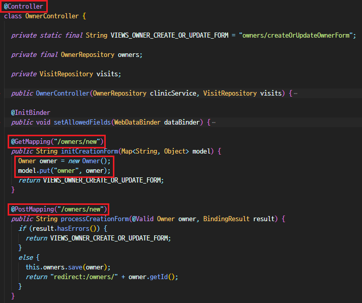 해당 클래스 안에서 @GetMapping이나 @PostMapping을 사용해 요청을 매핑한다. 또한, 요청을 처리하는 메소드들은 View를 리턴하고 View에서 사용하는 객체는 model에 담아 전달한다.