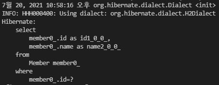 // 1차 캐시에 값이 없어 최초 1회 DB에 접근하여 select 쿼리를 실행하고