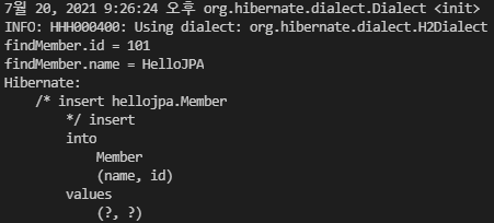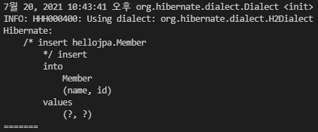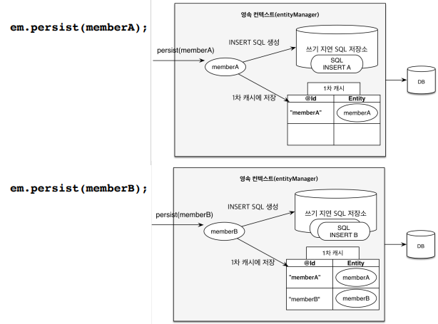 ※ EntityManager 내에는 쓰기 지연 SQL 저장소가 있어서 엔티티 등록 시 엔티티는 1차 캐시에 저장되고 insert 쿼리는 쓰기 지연 SQL 저장소에 저장되며 트랜잭션 commit() 이 요청되면 EntityManager는 DB에 insert 쿼리를 flush 하고 commit 한다.