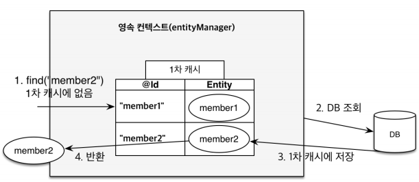 엔티티를 영속하게 되면 EntityManager 내 1차 캐시 공간에 key와 entity로 저장된다. 이때 저장된 엔티티를 조회할 땐 1차 캐시에서 조회를 하기 때문에 DB에 접근하지 않지만 저장되지 않은 엔티티를 조회할 경우 1차 캐시에 없는 것을 확인 후 DB에 접근하여 조회하고 조회된 값을 1차 캐시에 저장 후 해당 값을 반환한다.