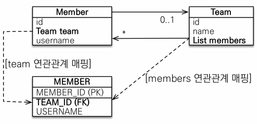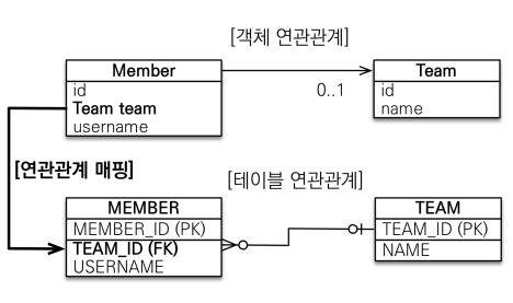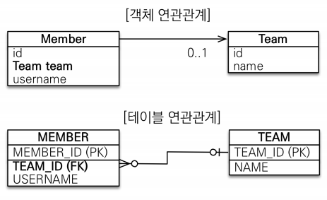 - 객체의 참조와 테이블의 외래키를 매핑