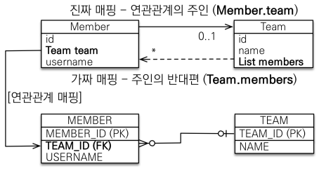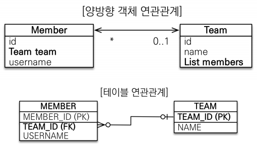 - 객체의 양방향 관계는 사실 양방향 관계가 아니라 서로 다른 단방향 관계 2개 이다.