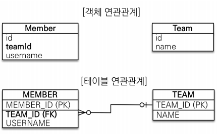 테이블은 외래키로 조인을 사용해서 연관된 테이블을 찾고 객체는 참조를 사용해서 연관된 객체를 찾는다. 따라서 테이블과 객체 사이에는 이런 큰 간격이 있다.