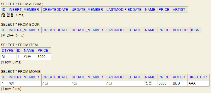 (4) Select SQL 및 결과 (상위 클래스 조회)