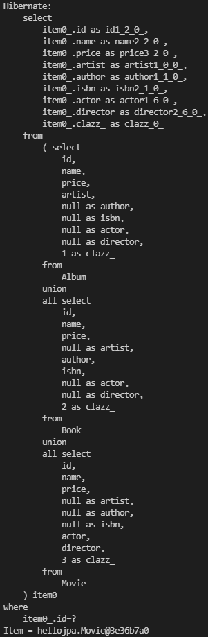 // 개별테이블 전략 상위 클래스 조회 (각각의 하위 테이블 조회하여 union)