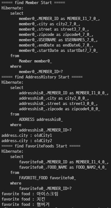 Set<String> favoriteFoods = findMember.getFavoriteFoods(); // 강제 호출, DB 조회