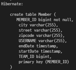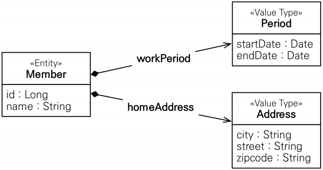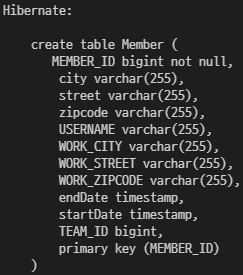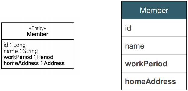 @Embeddable: 값 타입을 정의하는 곳에 해당 어노테이션 사용@Embedded: 값 타입을 사용하는 곳에 해당 어노테이션 사용- 임베디드 타입을 선언한 클래스에는 기본 생성자를 필수로 가져야 한다.