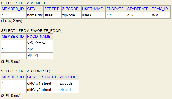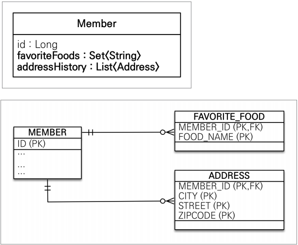 - 관계형 데이터베이스는 테이블 내에 컬렉션을 담을 수 있는 구조가 없기 때문에 별도의 테이블이 필요하다.