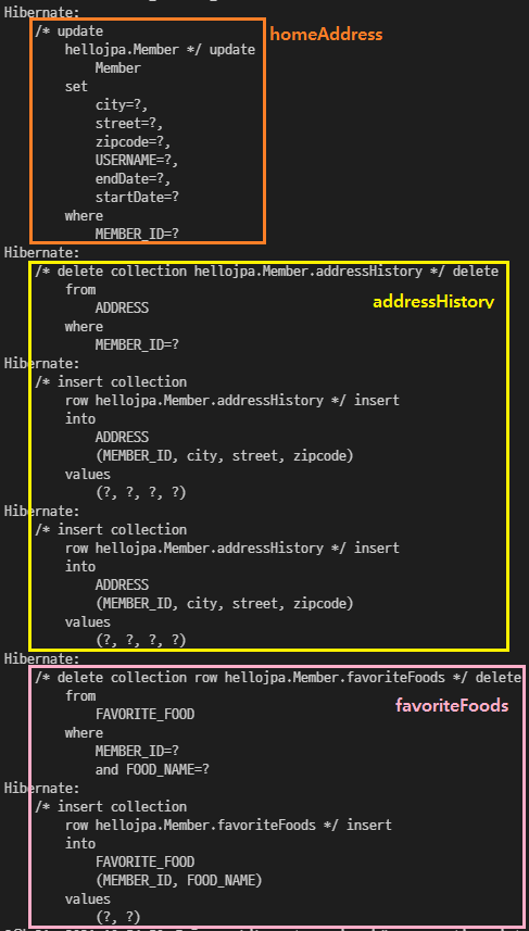 - 값 타입 컬렉션에 변경 사항이 발생하면 주인 엔티티와 연관된 모든 데이터를 삭제하고 값 타입 컬렉션에 있는 현재값을 모두 저장한다.