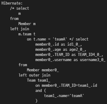String query = "select m from Member m left join m.team t on t.name = 'teamA'";