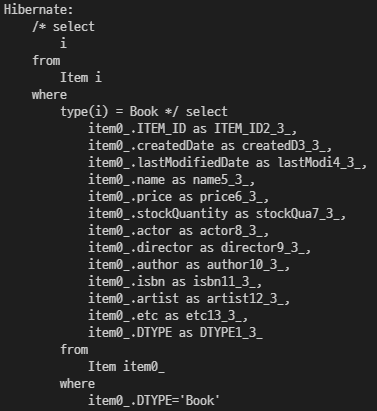 엔티티 타입 표현 예제로 이전 실습 패키지를 사용하여 DTYPE = 'Book'