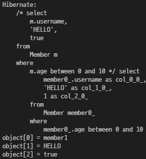String query = "select m.username, 'HELLO', true from Member m where m.age between 0 and 10";