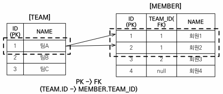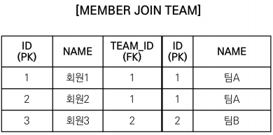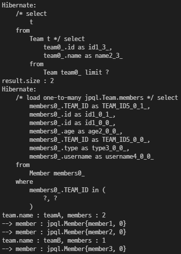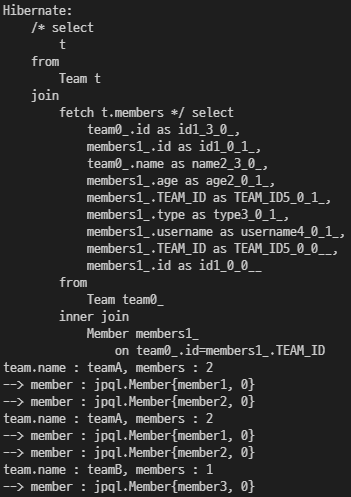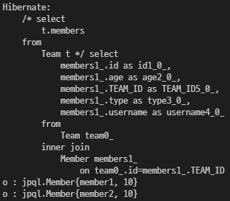 - JPQL은 결과를 반환할 때 연관 관계를 고려하지 않고 SELECT절에 지정한 엔티티만 조회하여 반환한다.