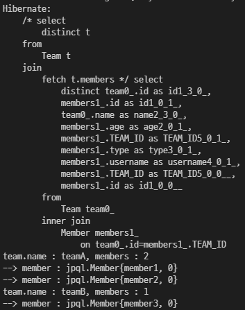 컬렉션 페치 조인 예제 결과를 보면 TeamA에 관한 정보가 2번 출력이 된다. 이때의 중복을 제거해보자.