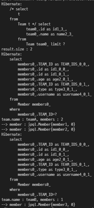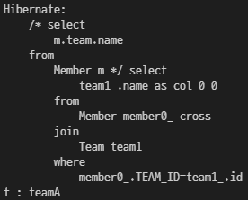 System.out.println("member.username : " + m.getUsername() + ", team.name : " + m.getTeam().getName());