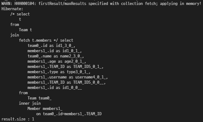 하이버네이트는 경고 로그를 남기고 메모리에서 페이징 (모든 데이터를 다 조회하기 때문에 매우 위험) - 연관된 엔티티들을 SQL 한번으로 조회하기 때문에 성능 최적화가 된다.