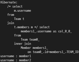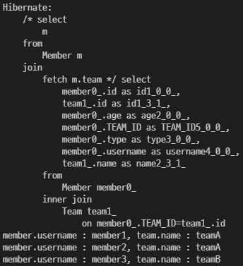 System.out.println("member.username : " + m.getUsername() + ", team.name : " + m.getTeam().getName());