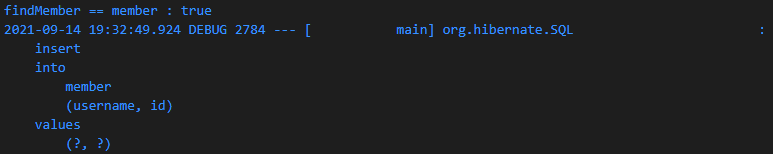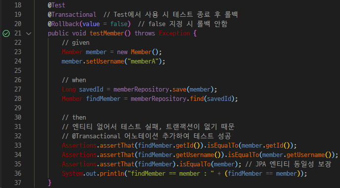 Assertions.assertThat(findMember).isEqualTo(member); // JPA 엔티티 동일성 보장