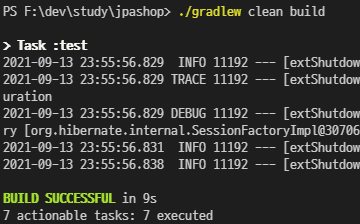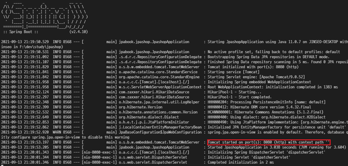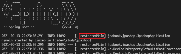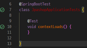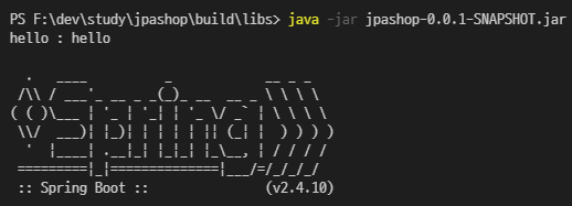 프로젝트가 정상적으로 생성, import 되었는지 JpashopApplication클래스를 실행시켜본다.