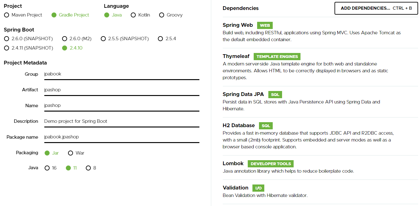 - Group Id : jpabook, Artifact Id : jpashop - 의존성 구성