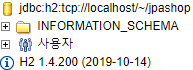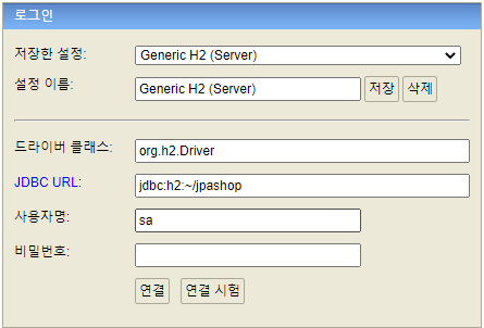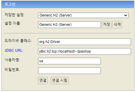 url: jdbc:h2:tcp://localhost/~/jpashop