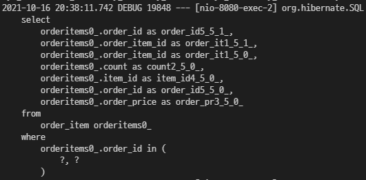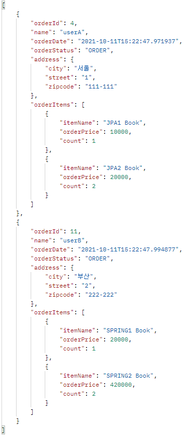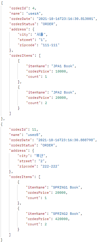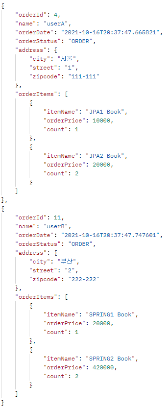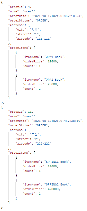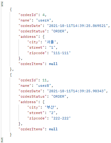 - OrderItem을 강제 초기화를 하여 가져왔어도 엔티티 정보가 그대로 노출되기 때문에 OrderDTO 내 OrderItem에 대해서도 OrderItemDTO를 만들어 사용해야 한다.