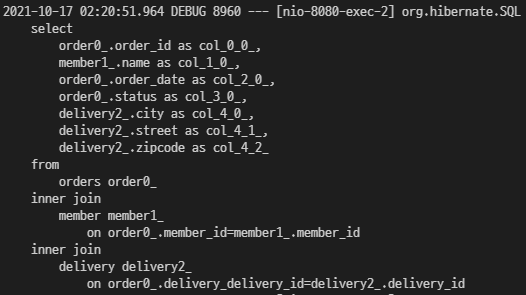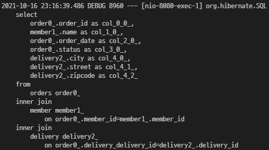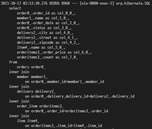 "select new jpabook.jpashop.repository.order.query.OrderFlatDTO(o.id, m.name, o.orderDate, o.status, d.address, i.name, oi.orderPrice, oi.count)" +