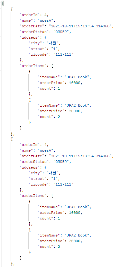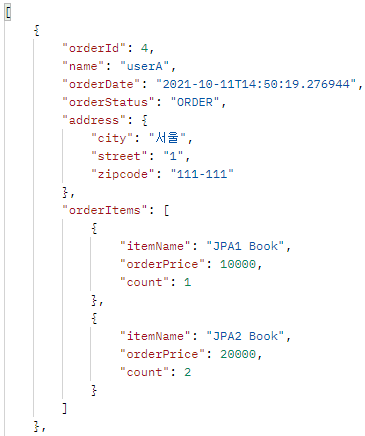 프록시 강제 초기화를 통해 OrderItem 정보도 조회되지만 엔티티 정보가 노출되는 위험성이 있다.