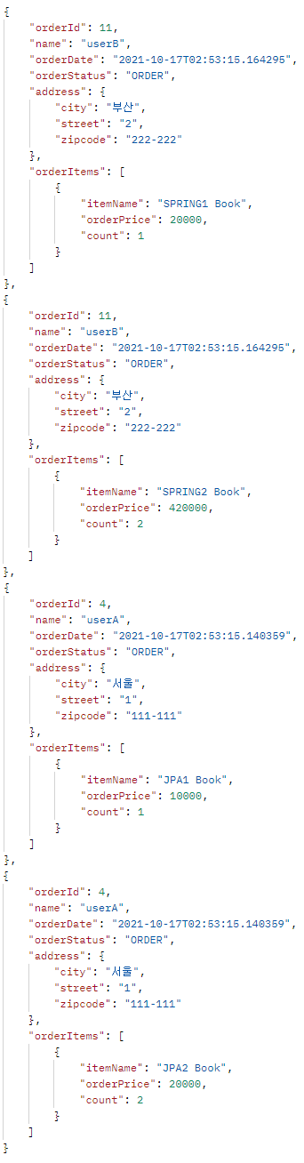 - OrderFlatDTO 타입으로 조회한 결과를 stream을 이용하여 OrderItemQueryDTO를 넣어서 OrderQueryDTO 형태로 리턴하는 로직이다.