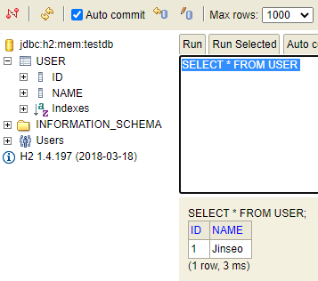 jdbcTemplate.execute("INSERT INTO USER VALUES (1, 'Jinseo')");