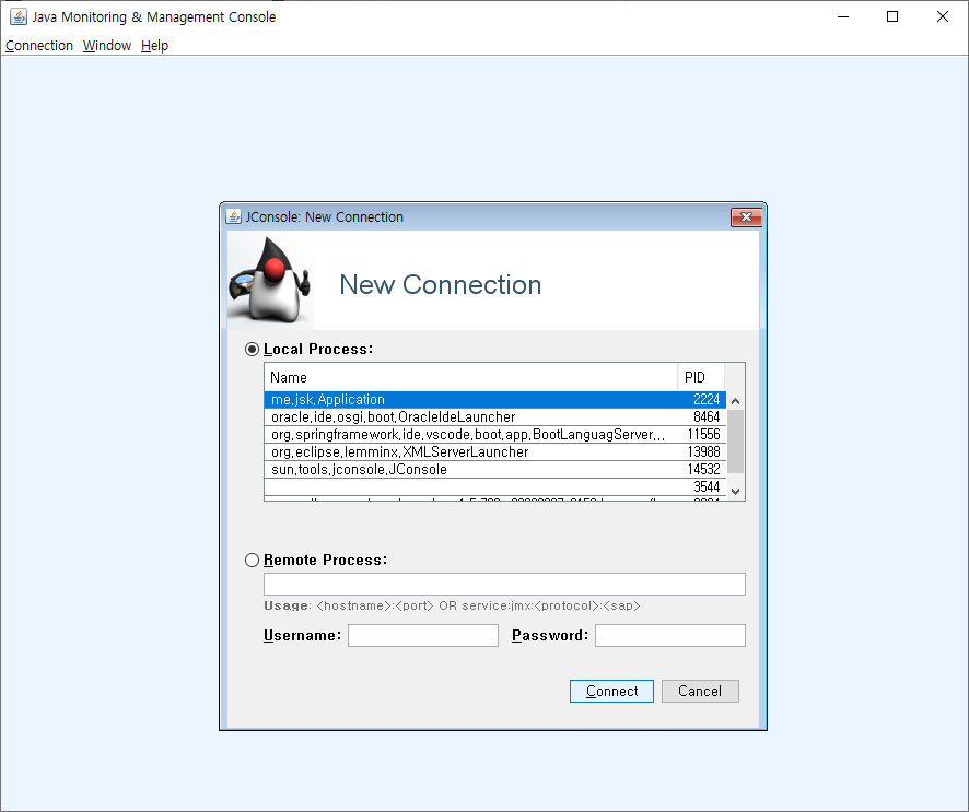 1. 로컬에서 동작하는 Web Application 프로세스 선택 후 Connect