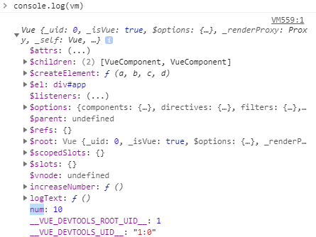 data에서 정의한 num변수가 뷰 인스턴스 바로 밑에 선언된 것을 볼 수 있다.