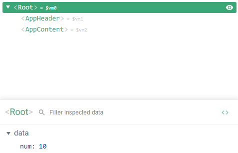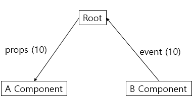 B -> Root로event를 통해num:10전달Root -> A로props를 통해num:10전달