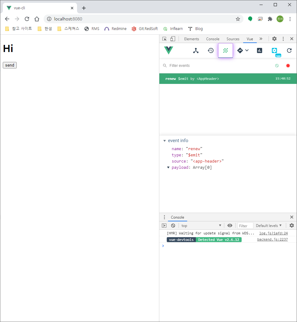 하위 컴포넌트에서 이벤트를 받아 상위 컴포넌트에서 정의한 renewStr함수가 실행되어 하위 컴포넌트로 전달할 data 속성의 str값이 변경되어 화면에 표시된다.